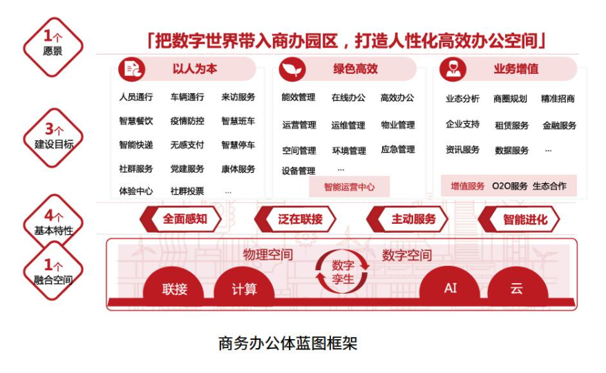 建設(shè)目標(biāo),則可以結(jié)合商辦特點(diǎn),把如何以人為本、綠色高效、業(yè)務(wù)增值在商辦園區(qū)展開設(shè)計(jì);同樣,全面感知、泛在聯(lián)接、主動服務(wù)和智能進(jìn)化 4個基本特征,1個融合空間等內(nèi)容,作為支撐的基礎(chǔ),可結(jié)合商辦園區(qū)的特點(diǎn),在技術(shù)實(shí)現(xiàn)層面加以詳細(xì)規(guī)劃。