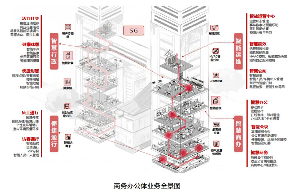 商務(wù)辦公體承載了人們辦公、交流與社交等功能。商務(wù)辦公智慧化發(fā)展的核心,是以用戶體驗(yàn)為中心,運(yùn)用數(shù)字化技術(shù)打造智慧化和以人為本的商務(wù)辦公環(huán)境,提高員工工作效率,降低能源損耗,保障辦公安全,由內(nèi)至外提升企業(yè)形象。用數(shù)字化技術(shù)賦能辦公,實(shí)現(xiàn)人們"智慧工作"的追求,具有時代意義。下面介紹商務(wù)辦公體藍(lán)圖框架及全景圖∶