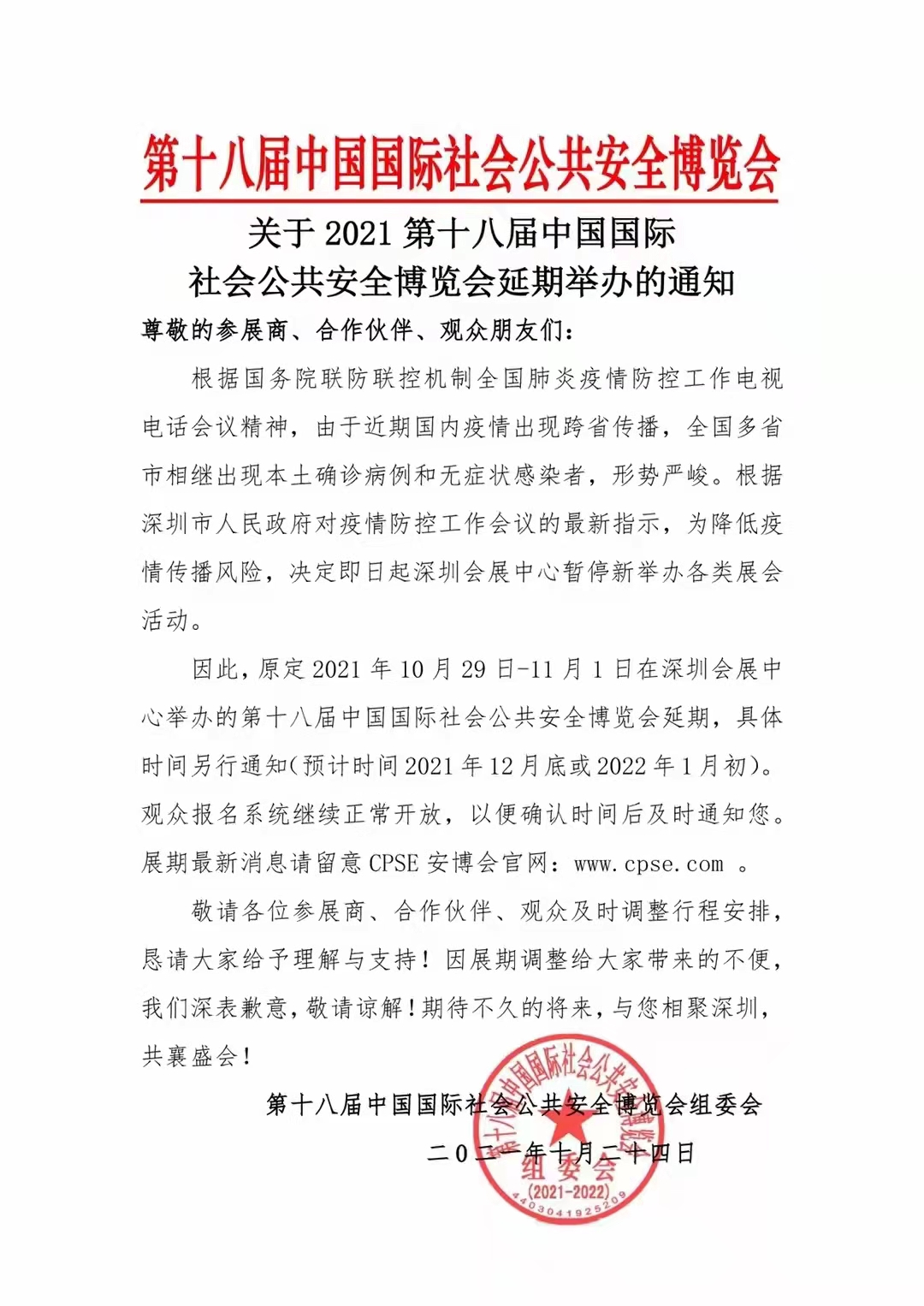 因此,原定 2021年10月29日-11月1日在深圳會展中心舉辦的第十八屆中國國際社會公共安全博覽會延期,具體時間另行通知(預計時間2021年12月底或2022年1月初)。
